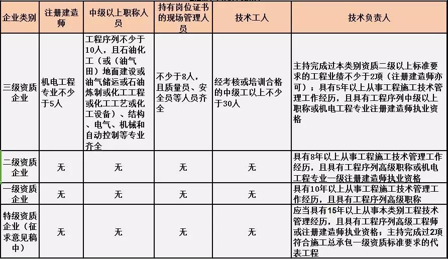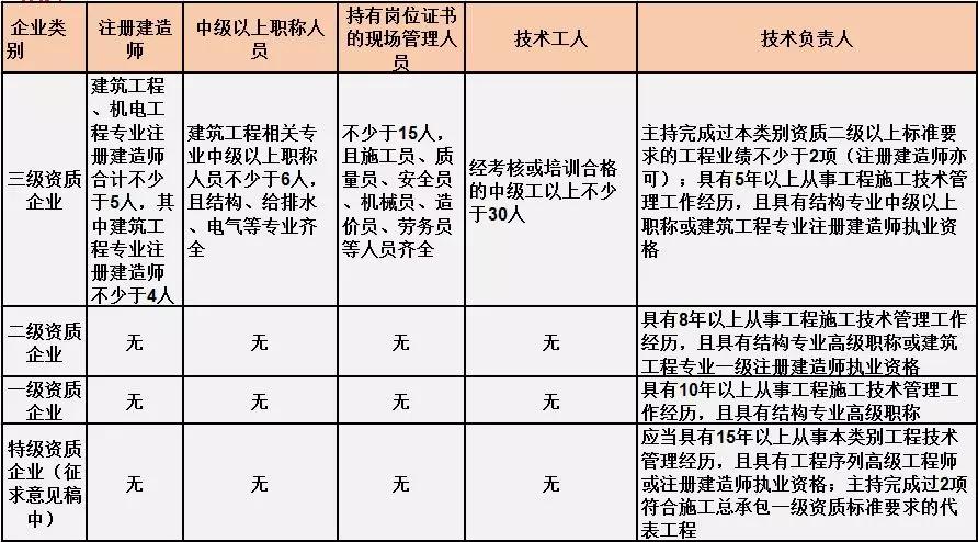 換句話說,并不是所有企業(yè)資質(zhì)都不要求有建造師等企業(yè)人員。施工總承包三級資質(zhì)企業(yè)對建造師等人員仍有要求,一級資質(zhì)、二級資質(zhì)企業(yè)保留技術(shù)負責人這一項要求,特級資質(zhì)另有規(guī)定。